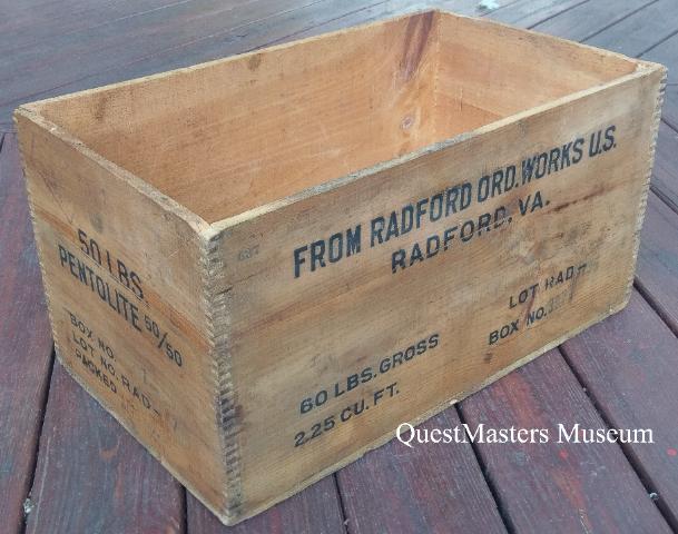 | Original Pentolite 50/50 Explosive Crate, shown left. This crate Pentolite 50/50 Explosives Crate was produced by the Radford Ordnance Works, Radford Virginia, April 1944. The replica, Stencil C124, is shown above. This stencil kit includes side and end stencil, to include the Ordnance Corps insignia. |