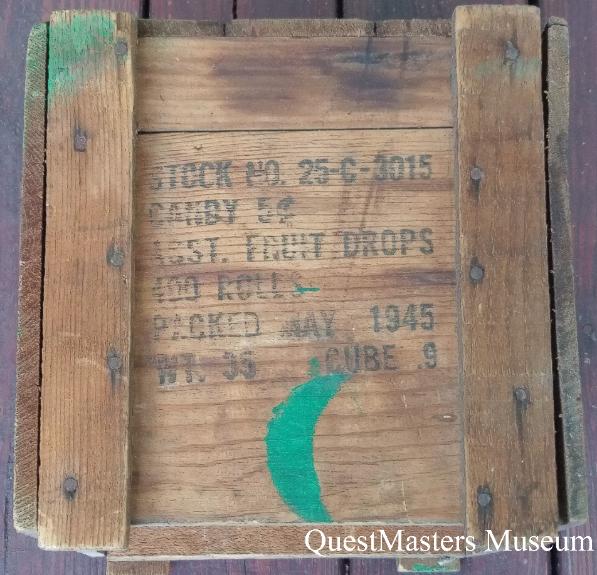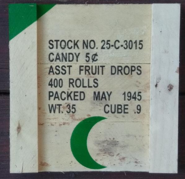 | Original WWII Assorted Fruit Drops Candy crate, shown left. The crate is marked on the side to the original manufacturer: M. Anklam, Saginaw Michigan and dated on the front May 1945. The corners of the crate are painted with green triangles for Quartermaster Corps Class III (Ration items) for overseas shipment. The replica, Stencil C104, is shown above. This stencil kit includes the side and end stencil. |