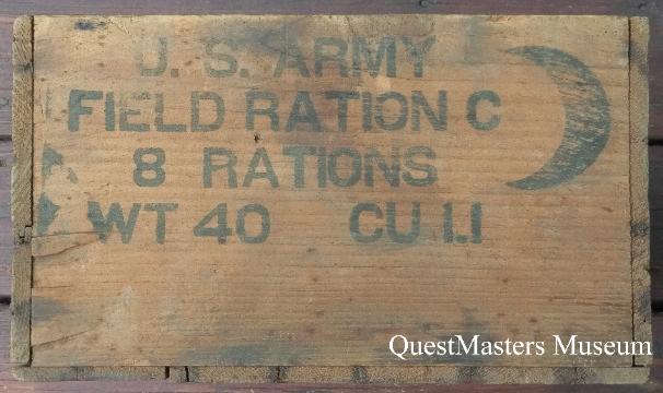 | C Ration and K Ration crates were designed during WWII to ship ready-to-eat food to the field, to feed each Service Member for one day - Breakfast, Lunch and Supper. These crates were made as single use, designed to be opened in the field to deploy the food and then discarded. They were not designed to be re-closed. Each replica crate, shown below, was hand crafted in the United States to the original size from original examples in the QuestMasters Museum collection, using reclaimed lumber for a more vintage look, with digitally rendered original stenciling. Each crate is shipped fully assembled and empty. Each crate can be ordered sealed with the original issue wire-banding (as delivered from the factory) or with a removable lid for storage purposes. These are perfect for a WWII re-enactment display and carrying on a WWII vehicle. |