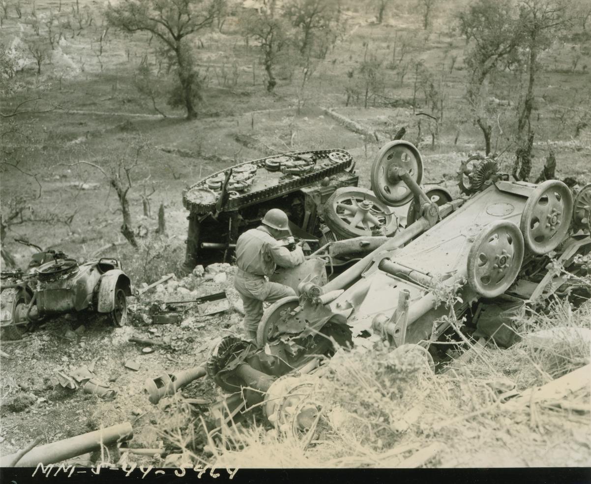 An original Signal Corps photograph, MM-5-44-5464, dated May 21st 1944, taken just left of the previous photo (the destroyed Marder III would be to the right of this photo), showing Allied Soldier inspecting a destroyed overturned German Raupenschlepper Ost (RSO) Artillery Tractor. Immediately next to the RSO is a German 7,5cm PAK 40 Anti-Tank Gun. In the background is a burned German Zundapp KS750 motorcycle with sidecar and an Italian Carro Armato M15/42 Tank, pressed into Wehrmacht service, which has been completely destroyed and lays on its left side. Esperia Italy, May 21st 1944, above photo. Photo from The National WWII Museum, New Orleans Louisiana. Photo analysis above conducted by QuestMasters Museum, January 2018. |