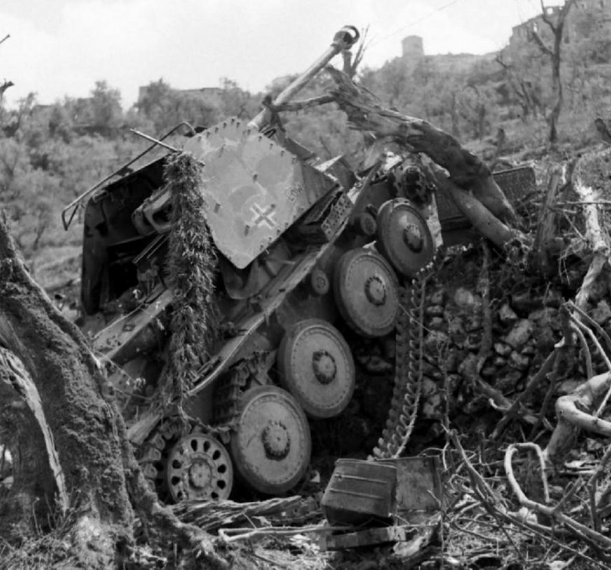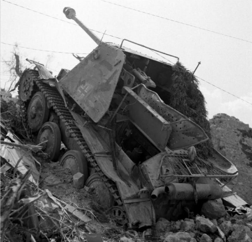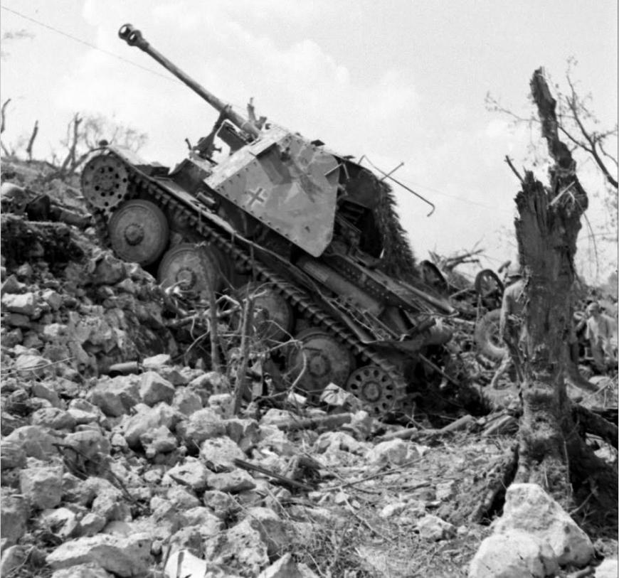 Another photo from this series shows another view of the destroyed heavily camouflaged German Marder III Ausf. H Self-Propelled Gun, of the 71st Infantry Division, 1st Company, Panzer Jager Abteilung 171 (1./Pz.Jg.Abt.171). The destroyed Italian Moto Guzzi ALCE 500 motorcycle, pressed into Wehrmacht service and painted in ordnance tan, now lays on its right side in the right foreground of this photo. Esperia Italy, May 1944, above photo. Photo analysis above conducted by QuestMasters Museum, January 2018. |