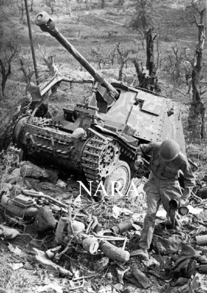 Another photo from this series showing the destroyed heavily camouflaged German Marder III Ausf. H Self-Propelled Gun, of the 71st Infantry Division, 1st Company, Panzer Jager Abteilung 171 (1./Pz.Jg.Abt.171) with the destroyed Italian Moto Guzzi ALCE 500 motorcycle, pressed into Wehrmacht service and painted in ordnance tan, laying on its right side. An Allied Soldier has picked up and is carrying a German Gas Mask Cannister for intelligence purposes or as a souvenir. Esperia Italy, May 1944, above photo. The photo has been watermarked for the National Archives and Records Adminstration. Photo analysis above conducted by QuestMasters Museum, January 2018. |