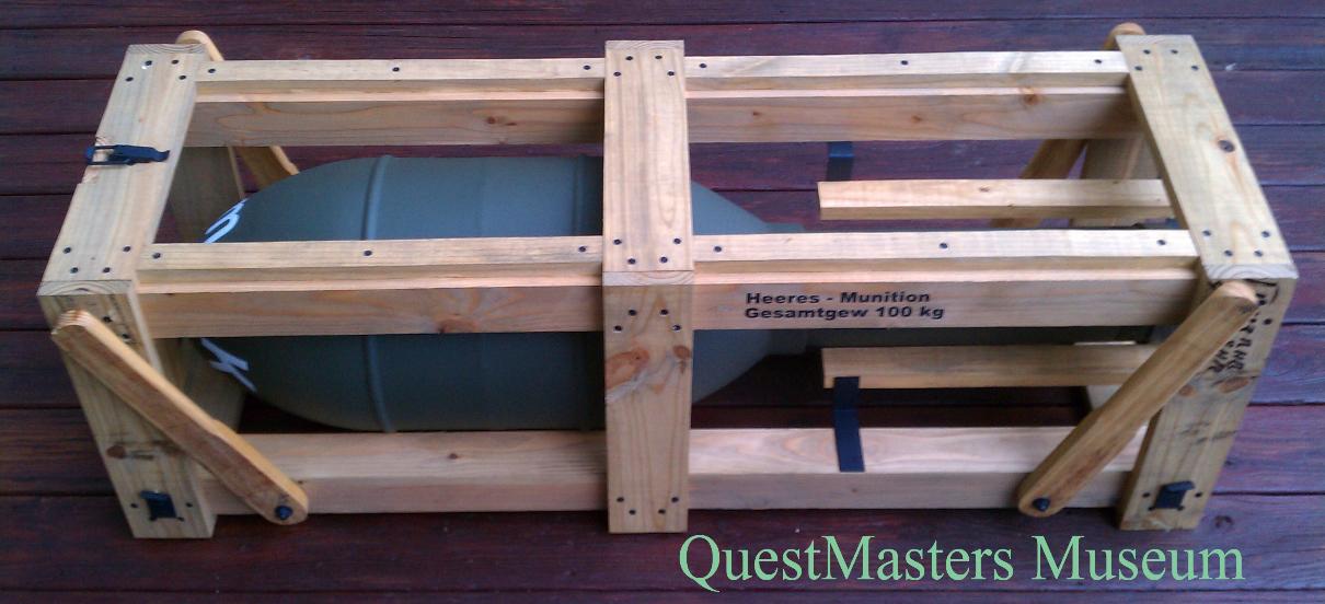 German WWII 32cm Wurfkorper Flamm, Nebelwerfer Rocket, above photo. In 1998, while conducting archeology work, QuestMasters recovered this German WWII 32cm Wurfkorper Flamm, Nebelwerfer rocket near the small town of Esperia, Italy, roughly 15 miles south-west of Cassino, Italy. This Nebelwerfer, completely inert, had been used as a trash can after WWII and was then left to decay in the elements and eventually discarded. After nearly 20 years, this German WWII 32cm Wurfkorper Fl, Nebelwerfer has been accurately restored by QuestMasters. The launch crate was fabricated by QuestMasters Museum. |