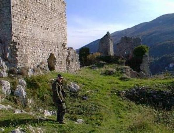 QuestMasters Museum conducting archeology work within the ruins, above left photo. Several U.S. .30-06 caliber fired projectiles were found in the soft-face of the Monastery slopes, as well as a vintage Coca-Cola bottle and a WWII German 5-liter gas can. Additionally, on the road leading to the summit, a German WWII gas mask carrier, a German WWII 5cm 3-round mortar carrier and a WWI German 8cm "Trench Art" shell casing were found. The southern tower of the Monastery, above right photo. The tower is in relatively good condition considering the fighting conducted around it. |