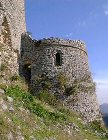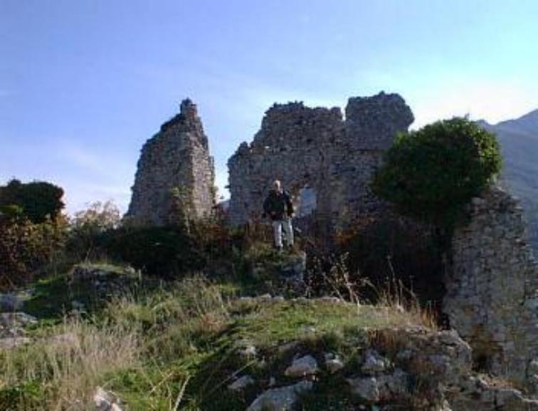 The summit above Esperia is home to a Middle-Age Monastery, which is now in ruins, above left photo. This area was occupied by the German Army during WWII and was used as an observation point for the western control of the "Gustav Line". QuestMaster "Jonny Reb" Ray is pointing eastward toward Monte Cassino, above right photo. This photo illustrates how well this mountain top controlled much of the movement in the Lire Valley. |